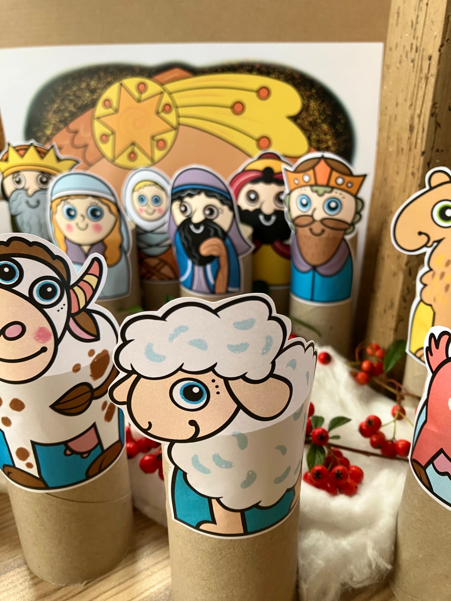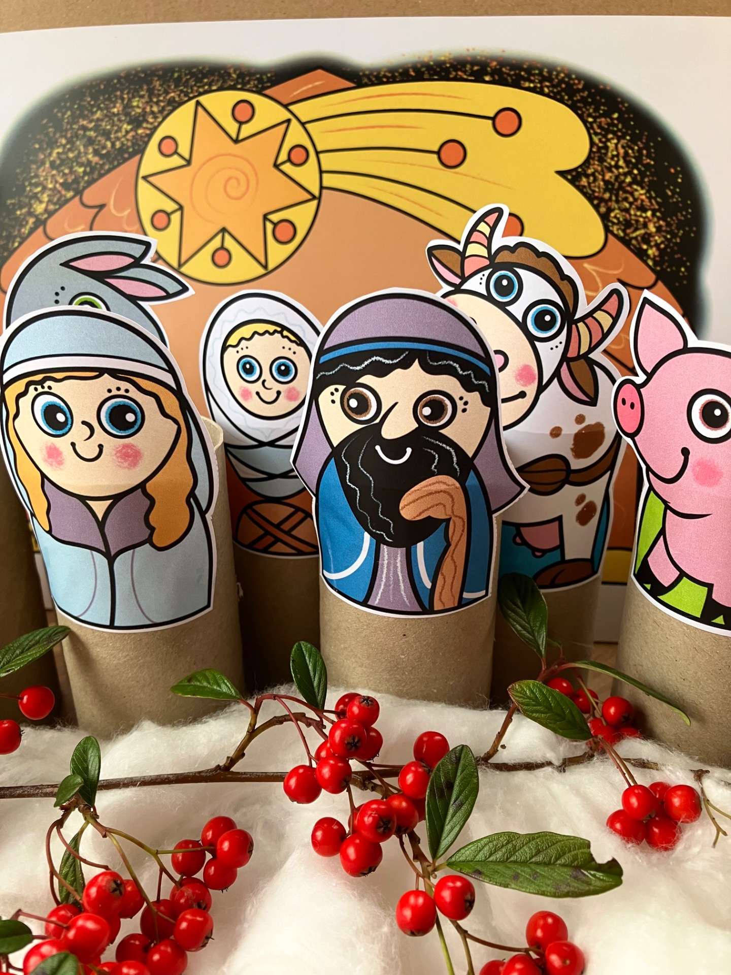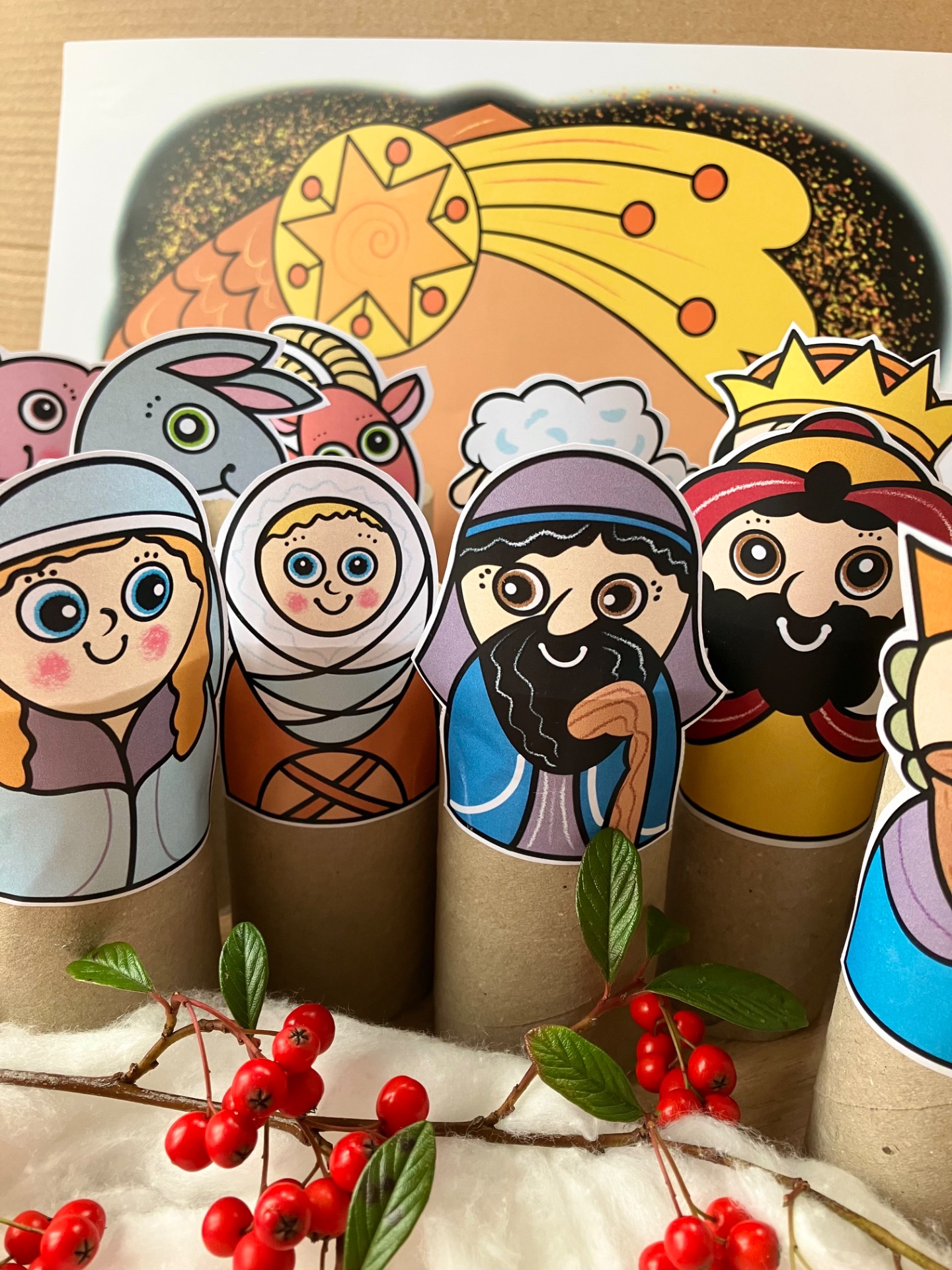 Obrázky stačí jen vystříhnout a nalepit na papírové ruličky. V kolekci obrázků najdete 12 postav (Josef, Marie, Ježíšek, tři králové, oslík, ovečka, kravička, koza, prasátko a velbloud) a obrázek s pozadím.