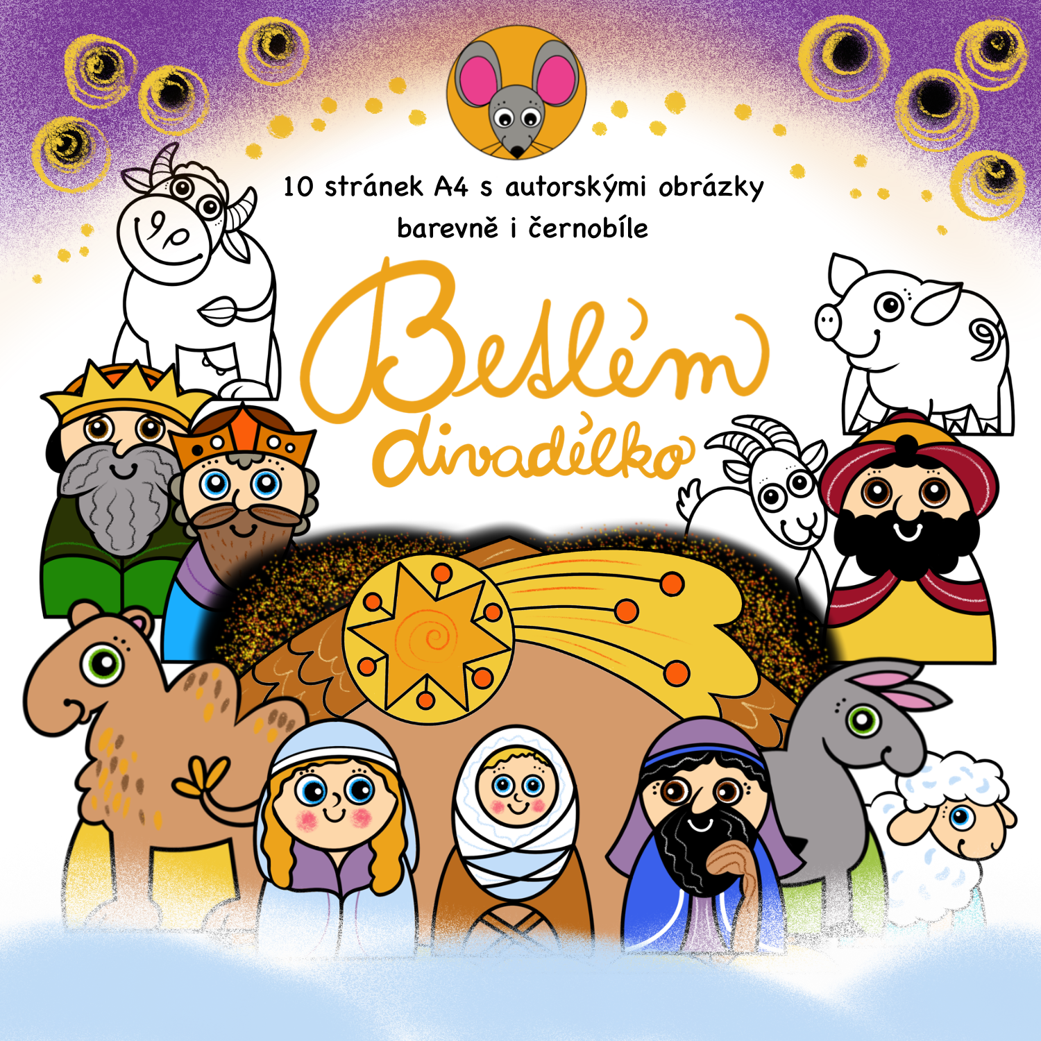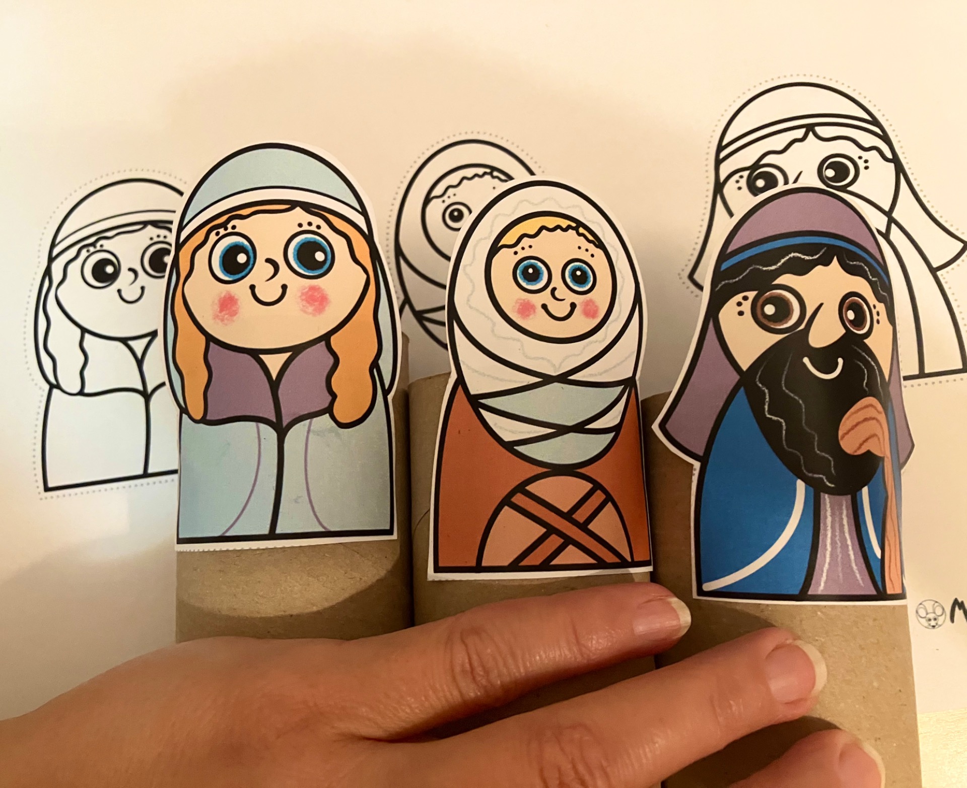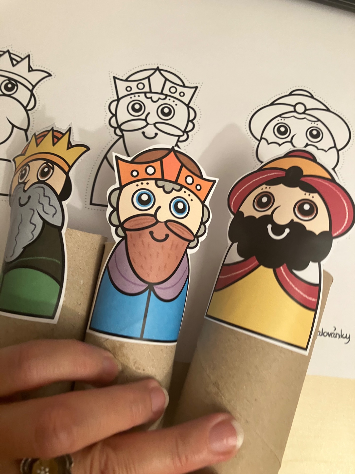 Obrázky stačí jen vystříhnout a nalepit na papírové ruličky. V kolekci obrázků najdete 12 postav (Josef, Marie, Ježíšek, tři králové, oslík, ovečka, kravička, koza, prasátko a velbloud) a obrázek s pozadím.