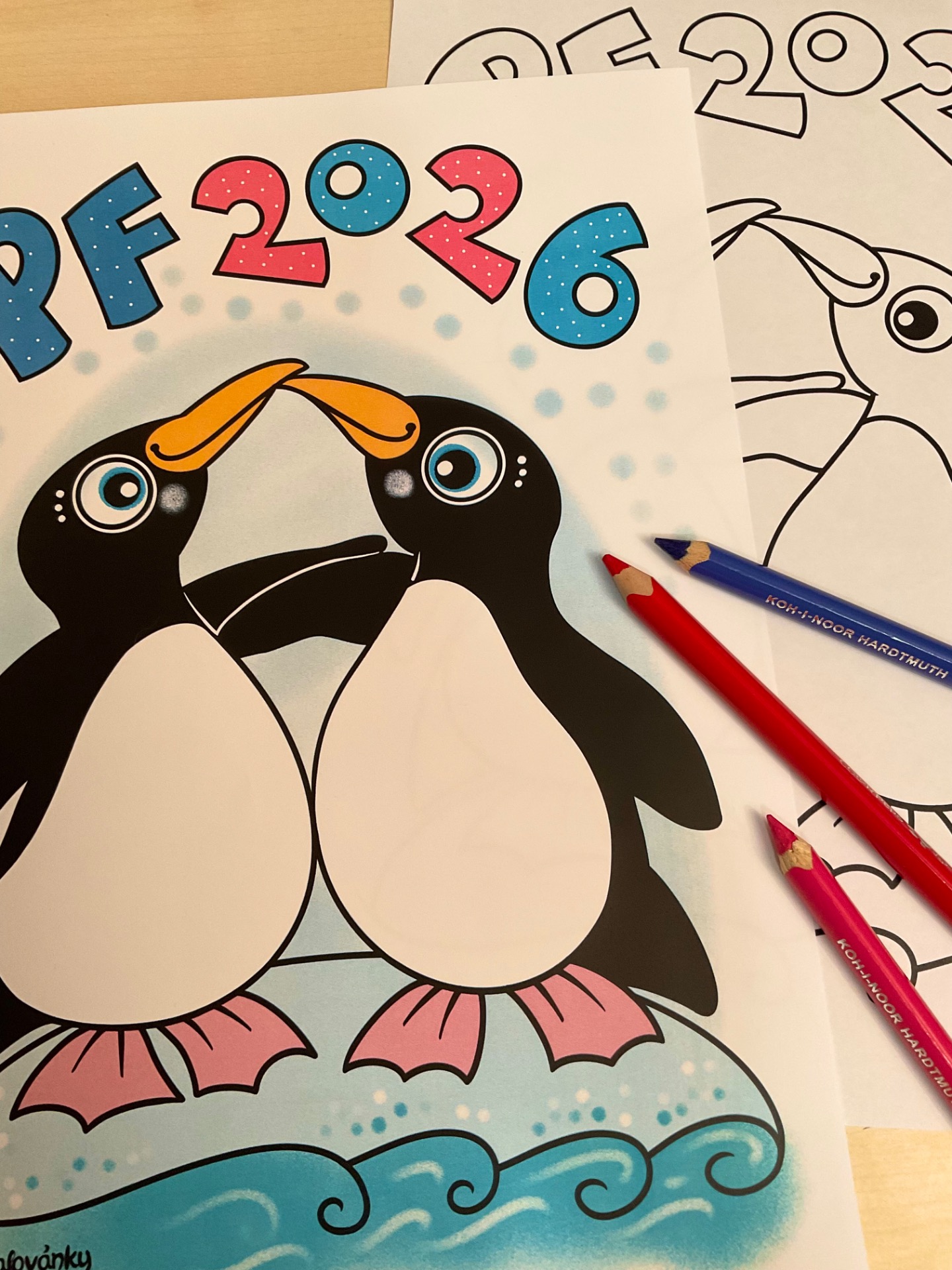 PF 2026 s veselými tučňáky jako barevný obrázek i omalovánka.