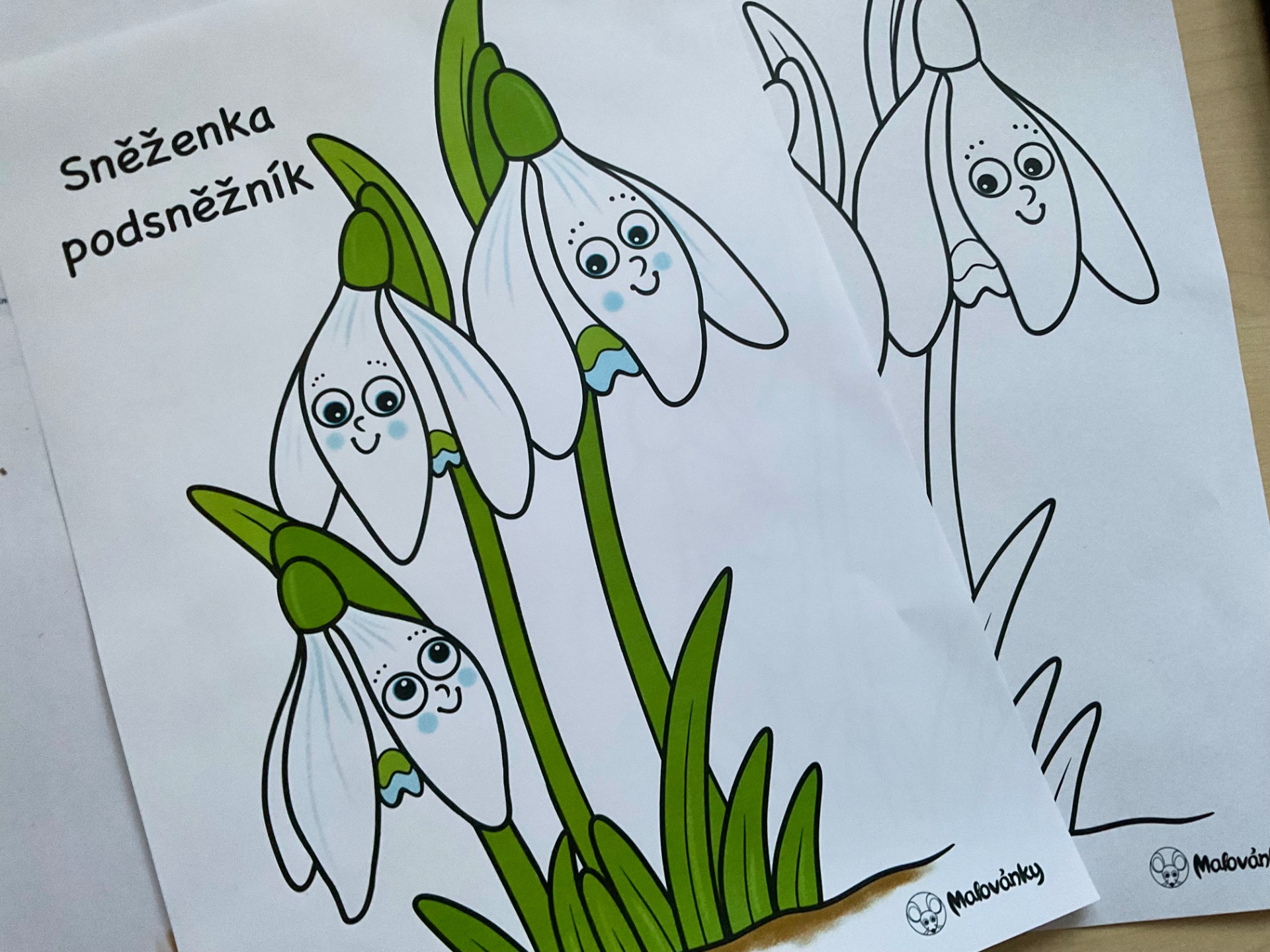 Obrázek sněženek s omalovánkou.